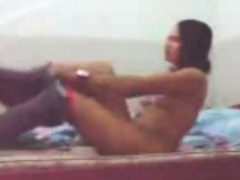 Asian teen rubs on spycam